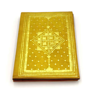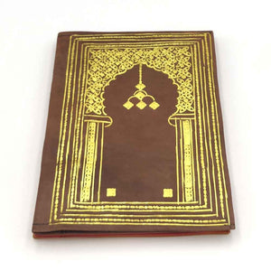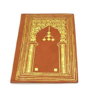 Forro de piel rojo decorado con motivos árabes dorados.Ideal para proteger libros o libretas.Medidas:Solapa: 18 x 25 cmAbierto: 36 x 18 cmMedidas internas:parte cubierta: 15 x 25 cmparte flexible: 6,5 x 25 cm