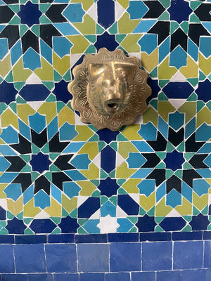 Fuente de mosáico artesanal andalusí elaborada, diseñada y ensambada en Marruecos por maestros artesanos de la famosa ciudad de FEZ mediante la técnica ancestral del azulejo de zelige, enseñada por los maestros artesanas de la antigua Al-Andalus y mantenida hasta ahora de padres a hijos.