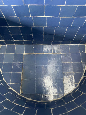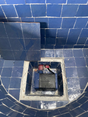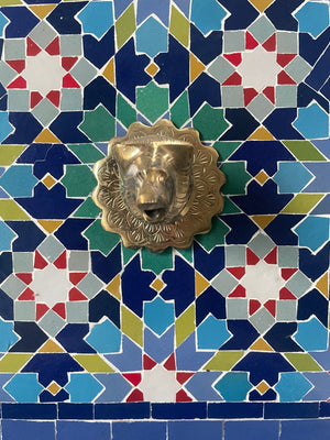 Fuente de mosáico artesanal andalusí elaborada, diseñada y ensambada en Marruecos por maestros artesanos de la famosa ciudad de FEZ mediante la técnica ancestral del azulejo de zelige, enseñada por los maestros artesanas de la antigua Al-Andalus y mantenida hasta ahora de padres a hijos.