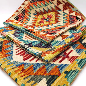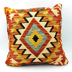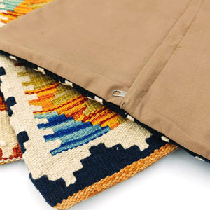 Descubre nuestro cojín kilim de lana 100% hecho a mano en Afganistán. Su diseño tradicional y tinte vegetal lo convierten en una pieza única para tu hogar.