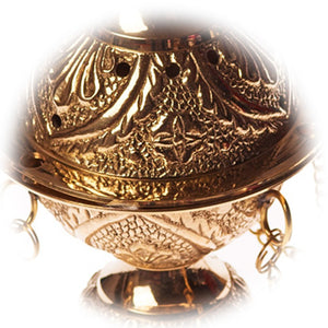 Incensario con cadena estilo andalusí dispone de tres cadenas y una cuarta pra levantar la tapa .Debido a sus resistentes cadenas es posible balancearlo en procesiones.Pieza de gran calidad.