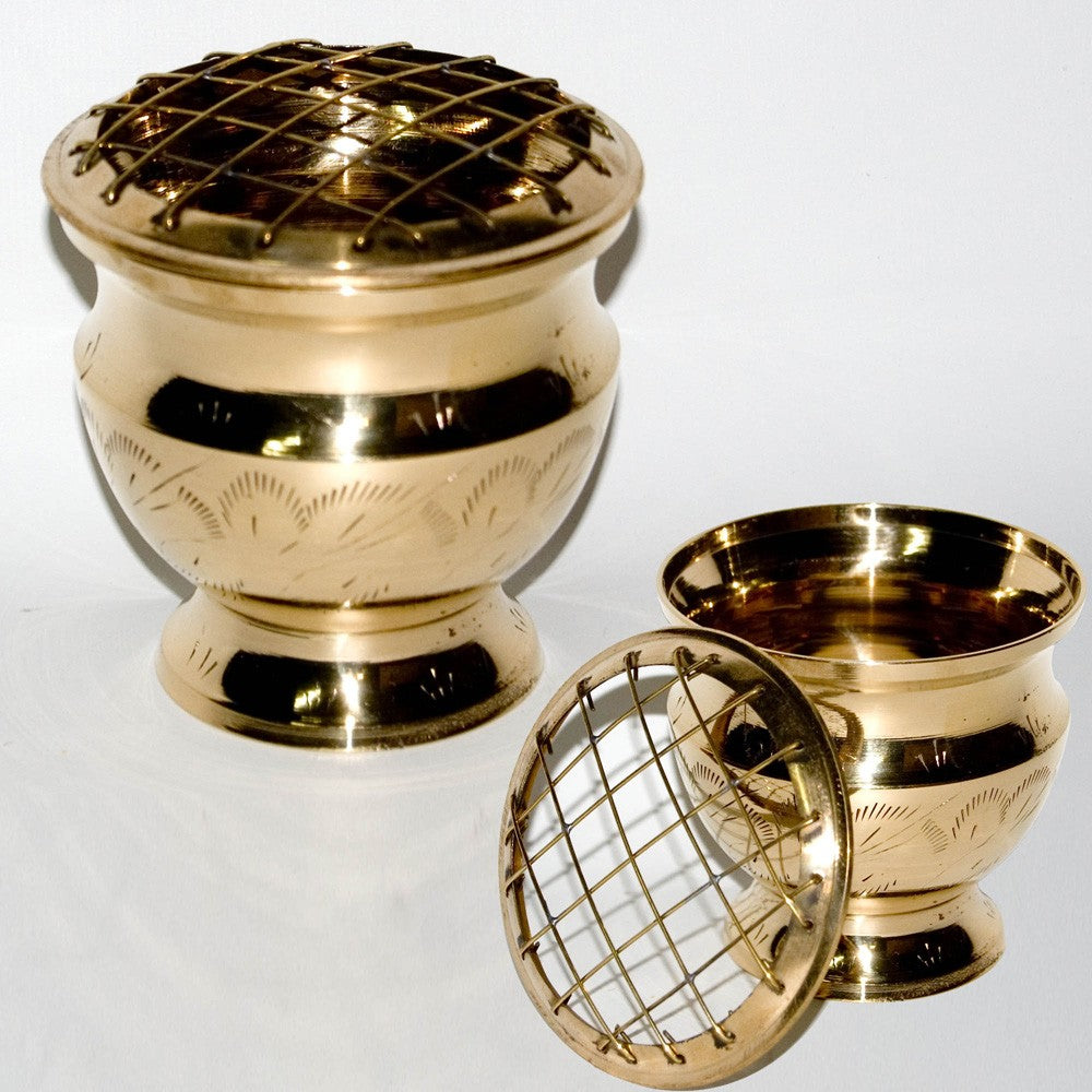 Incensario bronce grabado con rejilla para quemar incienso en grano.Producto de gran calidad y acabado. Disponible en 2 tamaños.