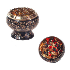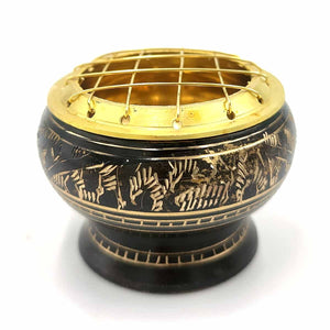 Incensario bronce grabado negro con rejilla para quemar incienso en grano.
