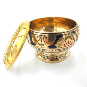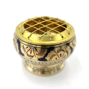 Incensario bronce grabado negro con rejilla para quemar incienso en grano. Disponible en azul, blanco y rojo..
