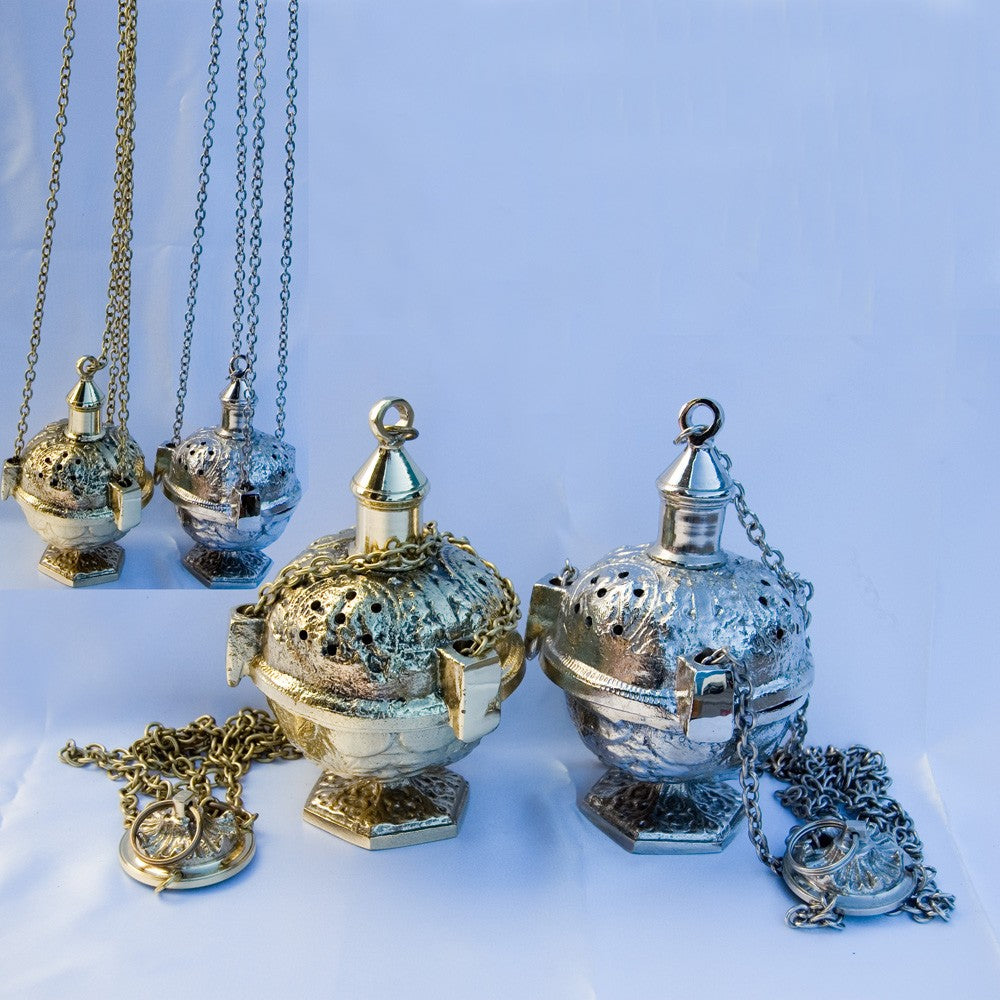 Incensario grabado realizado en fundición con cadena agarre y apertura de tapa. Disponible en bronce o níquel.