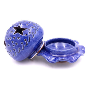 Incensario de cerámica o porta velas de cerámica esmaltada y calada con decorados y tallada. Artesanía marroquí ideal para usar como quemador de incienso en resinas o usarla como portavelas que creara sombras gracias a su diseño y colores andalusí.