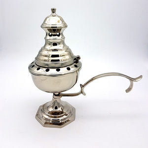 Incensario de Bronce o acabado en niquel, con asas largas y una base alta para envitar posibles quemaduras, gran capacidad para quemar incieso, en iglesias o en el hogar, perfecto para las cofradias, o hermandades en Semana santa..