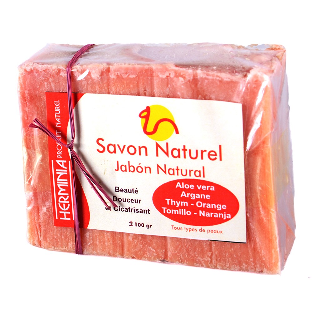 Ingredientes: aceite de argán, ricino, oliva, coco y girasol. Leche de camello, de cabra y de soja. Extractos de aloevera, cactus y tomillo, glicerina. Vitamina C y E. Hojas de tomillo y aceite esencial de naranja.