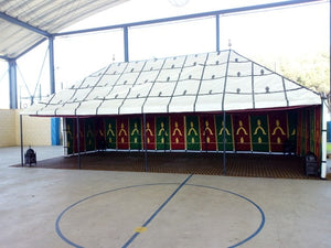 Las paredes son tipo cortina para abrir y cerrar fácilmente. También se pueden quitar o poner mediante una barra si se desea usar la Jaima Árabe como una carpa sin paredes.