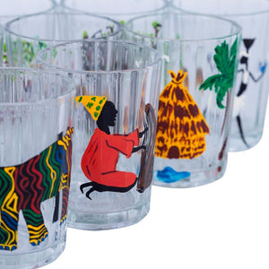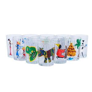 Producto único y exclusivo. Juego de 12 vasos, cada cual distinto y mágico. Diseñados y pintados a mano por un artista africano. Sólo plasmó una vez en vidrio su pintura tribal.
