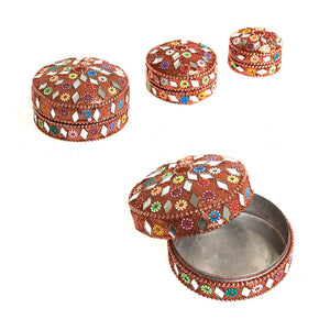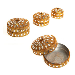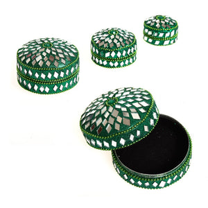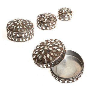Juego 3 cajitas decoradas con brillantes y forradas interiormente en purpurina.Las cajas se guardan una dentro de la otra al estilo muñecas rusas.Ideal para regalo.Disponible en varios colores.Medidas:Pequeña: 5 cmMediana: 6 cmGrande: 7 cm