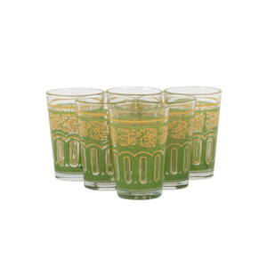 Juego de 6 vasos de te Dobles de cristal pintados de color verde y dorado. Son ideales para servir el té.