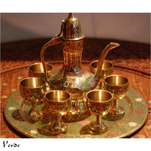 Juego de té decorativo hecho en bronce grabado. Consta de bandeja, tetera y seis vasos. Disponible en cuatro colores: azul, verde, rojo y negro (multicolor agotado). Ideal para regalo. Es un objeto que no puede faltar en cualquier lugar que se le