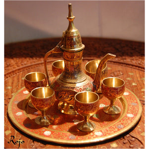 Juego de té decorativo hecho en bronce grabado. Consta de bandeja, tetera y seis vasos. Disponible en cuatro colores: azul, verde, rojo y negro (multicolor agotado). Ideal para regalo. Es un objeto que no puede faltar en cualquier lugar que se le quiera dar un ambiente andalusí.