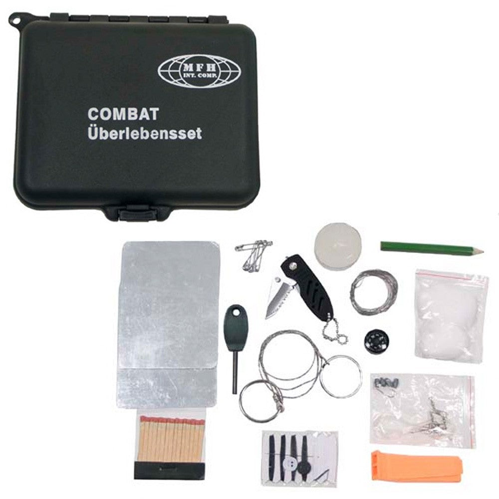 Kit supervivencia presentado en caja metálica. Incluye cosas importantes para situaciones de emergencia:- Mini navaja - Silbato - Alambrede corte con anillas (como una segueta). - Alambre - Set básico pesca - Algodón para encendido de fuego. - Cerillas - 1 vela - 1 Lápiz - Mini-brújula - Set costurael pasador de seguridad - Encendedor pedernal - 2espejos - Imperdibles Tamaño caja:12 x 10x3,5 cm