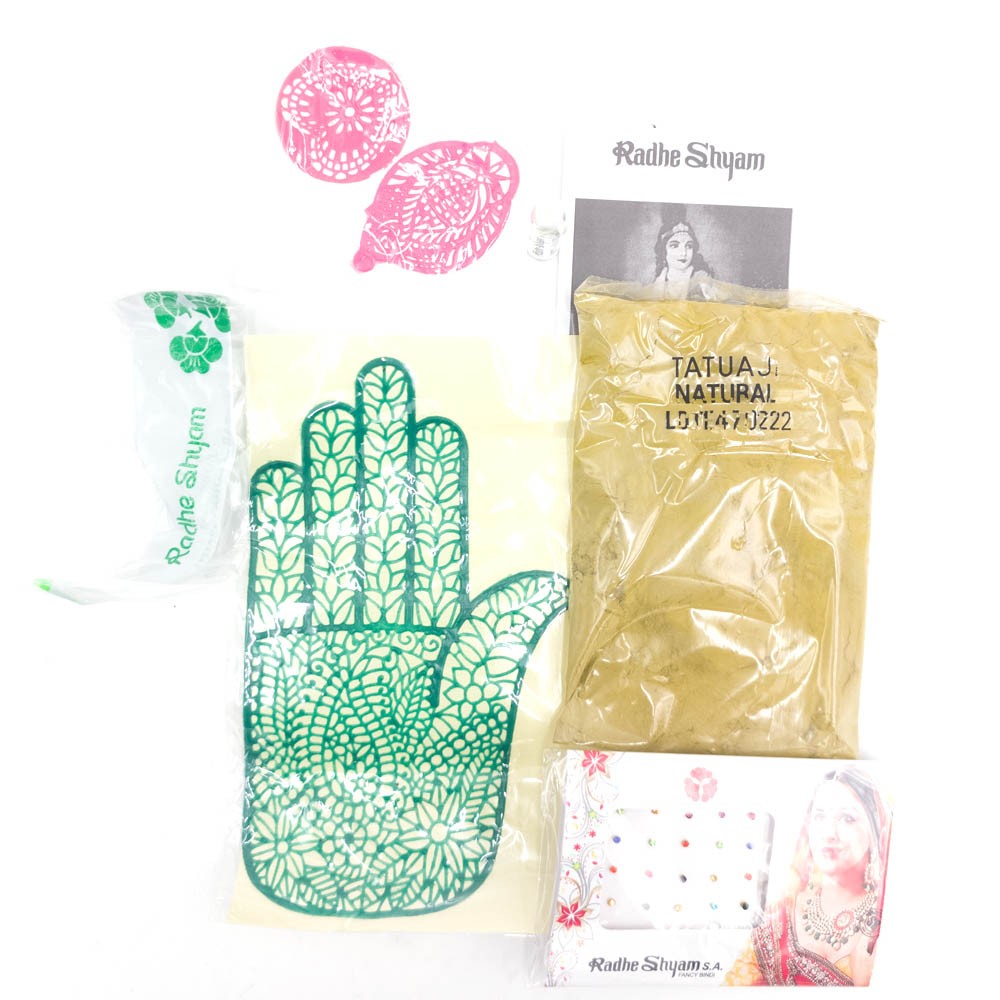 henna (50 gr), plantillas, dosificador, aceite especial para la mezcla, manual de utilización y bindis decorativos.