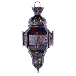 Lámpara marroquí colgante hecha mano con metal y cristal. Dispone de una anilla para colgar. Gracias a su combinación de colores y los mosaicos tallados, emanará una luz única que creará un ambiente mágico y relajante allá donde se coloque.