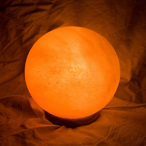 Esfera de sal pulida presentado en base de madera. Incluye la instalación eléctrica, lista para usarse.