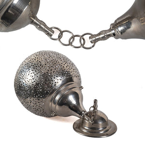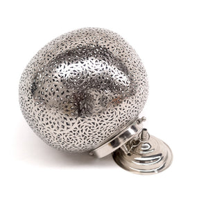Lámpara árabe deluxe esfera calada con diseño vanguardista bañada en níquel. Incluye cadena y soporte.