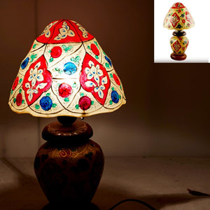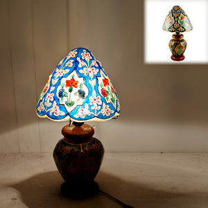 Lámpara de mesa realiza artesanalmente con piel de camello y decorada con motivos florales.Disponible en 2 tamaños.Producto muy bonito y bien acabado.La instalación eléctrica viene incluida.Medidas:Pequeño: 37 x 18 cmGrande: 40 x 22 cm