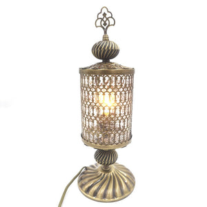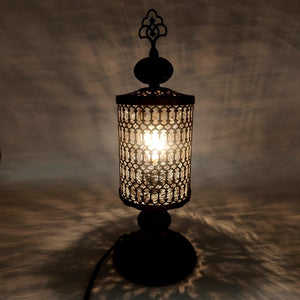 Lampara para sobremesa, mesita de noche, mesita auxiliar, para interior realizado artesanalmente en Turquía con cristal artesano y con metal calado con diseños geométricos.