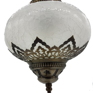 La tulipa de cristal craquelado va acompañada de una celosia de metal cortada por laser, la que añadira un toque especial a su lampara.