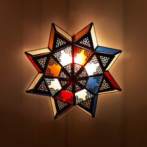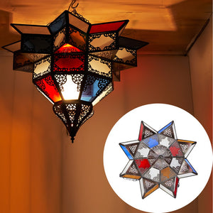 Lampara plafón arabe con diseño de estrella. Cristales multicolor con calado árabe.Crea un ambiente agradable que recuerda a oriente. Producto artesano.