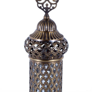 Lámpara turca colgante hecha con metal y cristal, empleando la técnica del metal craquelado. Dispone de una base para colocarla en mesa o en el suelo. Gracias a los mosaicos tallados, emanará una luz única que creará un ambiente mágico y relajante allá donde se coloque.