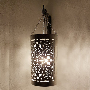 Decorada con el calado artesanal tipico de marruecos, creando formas geometricas y florales, muy bonita y le dara una luz muy agradabe y relajadora, perfecto para lampara de entrada o pasillera. Cualquir lugar donde la coloque quedara estupendamente.