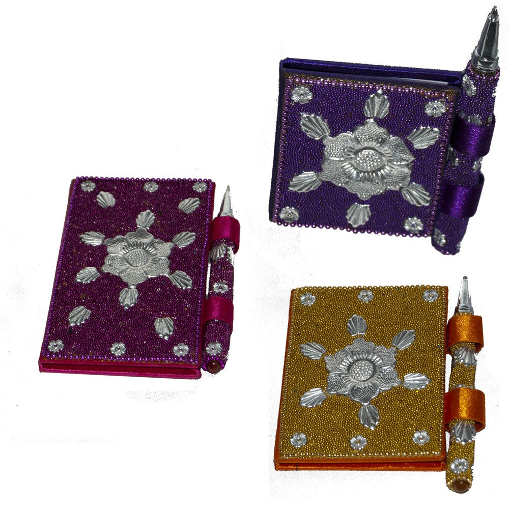 Libreta con brillantes, incluye bolígrafo que cierra la libreta.