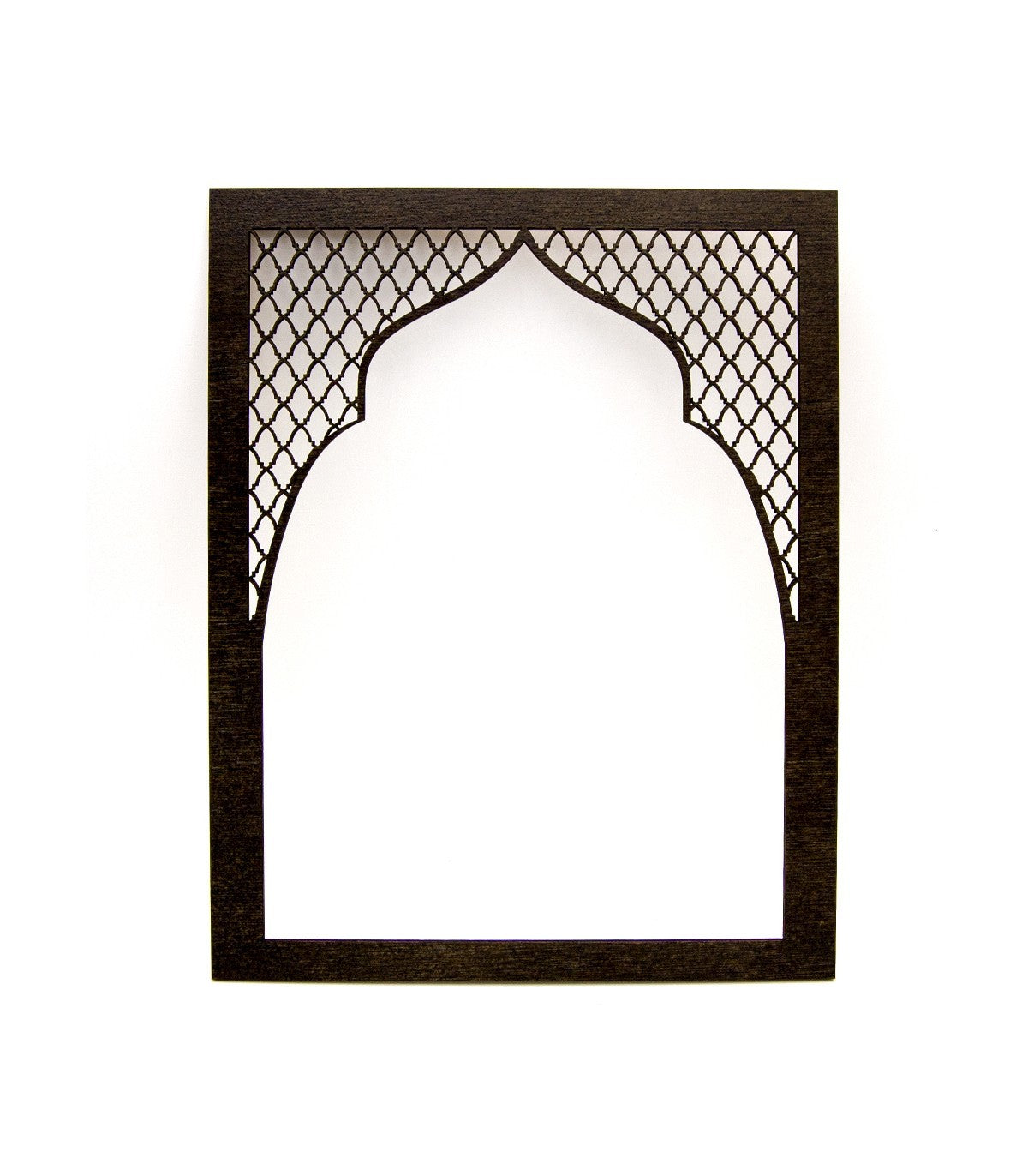 Marco de madera laminada barnizada. decorada con motivos árabes inspirados en la Alhambra granadina. Diseño con forma de puerta andalusí morisca. Ideal para colocar como marco de espejo, o como marco de fotos.
