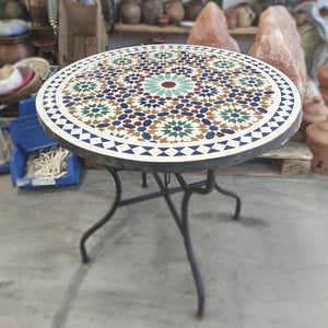 Mesa de mosaico Jardin, terraza, exterior para verano artesanal andalusí elaborada, diseñada y ensamblada en Marruecos por maestros artesanos de la famosa ciudad de FEZ mediante la técnica ancestral del azulejo de zelige, enseñada por los maestros artesanas de la antigua Al-Andalus y mantenida hasta ahora de padres a hijos.