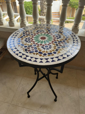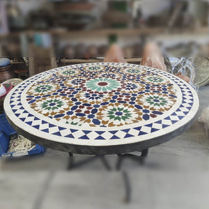 Mesa de mosaico artesanal andalusí elaborada, diseñada y ensamblada en Marruecos por maestros artesanos de la famosa ciudad de FEZ mediante la técnica ancestral del azulejo de zelige, enseñada por los maestros artesanas de la antigua Al-Andalus y mantenida hasta ahora de padres a hijos.