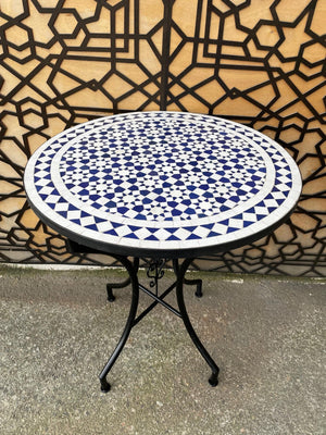 Mesa de mosaico Jardin, terraza, exterior para verano artesanal andalusí elaborada, diseñada y ensamblada en Marruecos por maestros artesanos de la famosa ciudad de FEZ mediante la técnica ancestral del azulejo de zelige, enseñada por los maestros artesanas de la antigua Al-Andalus y mantenida hasta ahora de padres a hijos.