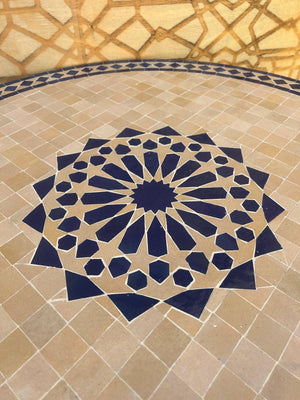Mesa de mosaico artesanal andalusí elaborada, diseñada y ensamblada en Marruecos por maestros artesanos de la famosa ciudad de FEZ mediante la técnica ancestral del azulejo de zelige, enseñada por los maestros artesanas de la antigua Al-Andalus y mantenida hasta ahora de padres a hijos.