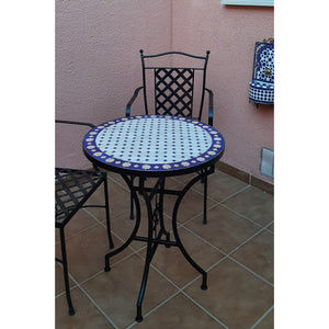 Cada mesa está fabricada artesanalmente con un impresionante diseño de mosaico, utilizando técnicas transmitidas de generación en generación. Su estructura sólida con patas plegables de forja garantiza durabilidad y resistencia, mientras que su altura de 72 cm y variedad de diámetros disponibles la hacen versátil y adaptable a diferentes espacios.