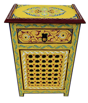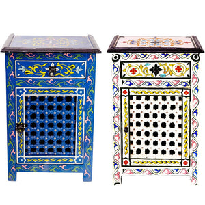 Mesita de noche andalusí pintada a mano. La puerta está decorada con una celosía de madera muy bonita.Disponible en varios colores. Realizado artesanalmente.