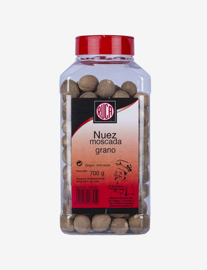 Es la semilla desprovista del arilo de la Myristica fragans, Houttyl; nuez ovoide, de color pardo grisáceo y superficie rugosa, pero suave al tacto. Sabor muy aromático, cálido y resinoso. Aunque hay diversos orígenes, actualmente comercializamos la procedente de Indonesia.