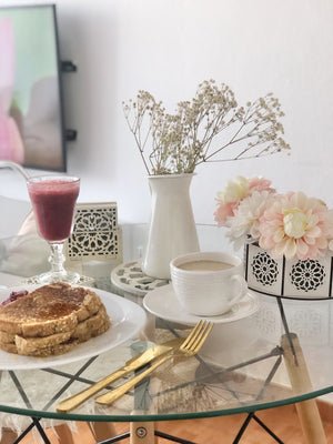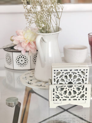 Pack decorativo de 6 x salvamantel estilo árabe + 6 posavasos + cajita bombonera. Ideal para decoración árabe estilo andalusi. Celosia árabe decorativa.