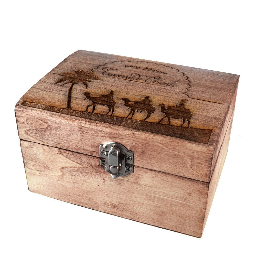 El pack además de incluir una preciosa caja grabada mediante laser con la silueta de los reyes magos, incluye un bonito incesario de bronce , un tubo de carbón, unas pinzas para carbón y tres inciensos en grano para quemar (oro, incienso y mirra)