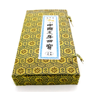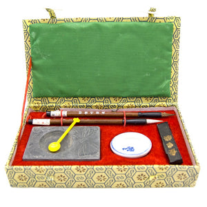 Estucho o pack de tinta china, incluye pinceles, tinta, tintero. Viene presentado en una cajita forrada interior y exteriormente por tela, por lo que es ideal para regalos, tambien se puede usar para la escritura árabe ya que los metodos son parecidos en algunos aspectos.