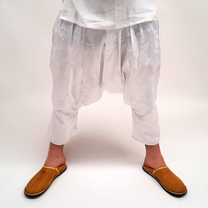 Pantalón Bombacho para hombre, realizado artesanalmente. Tela estilo seda decorada con motivos florales. Tela brillante, con bolsillo decorados con bordados.