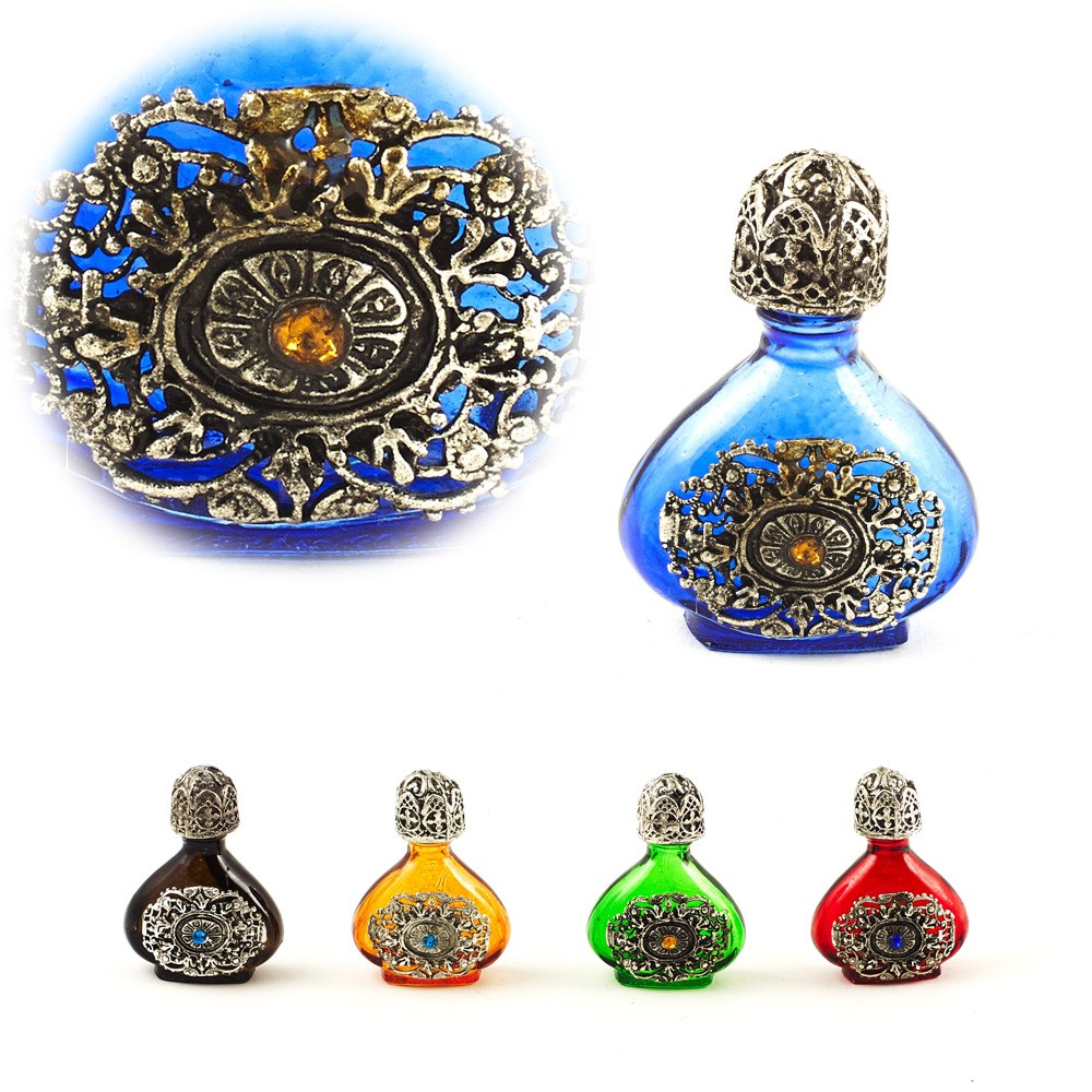 Perfumero pequeño realizado artesanalmente en cristal, decorado con filigrana de alpaca y piedra preciosa. Disponible en 6 colores. Muy bonito y bien acabado. Ideal para regalar y coleccionistas.