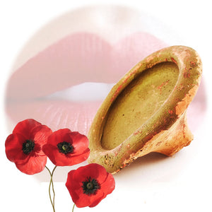 Pintalabios natural realizo con hojas de amapola. Se presentan en bol de cerámica. Aunque el acabado es marrón osucuro al utilizarlo deja un rojo intenso. Dura bastante. Para usarlo se humedece un pincel y se unta suavemente sobre la superficie.