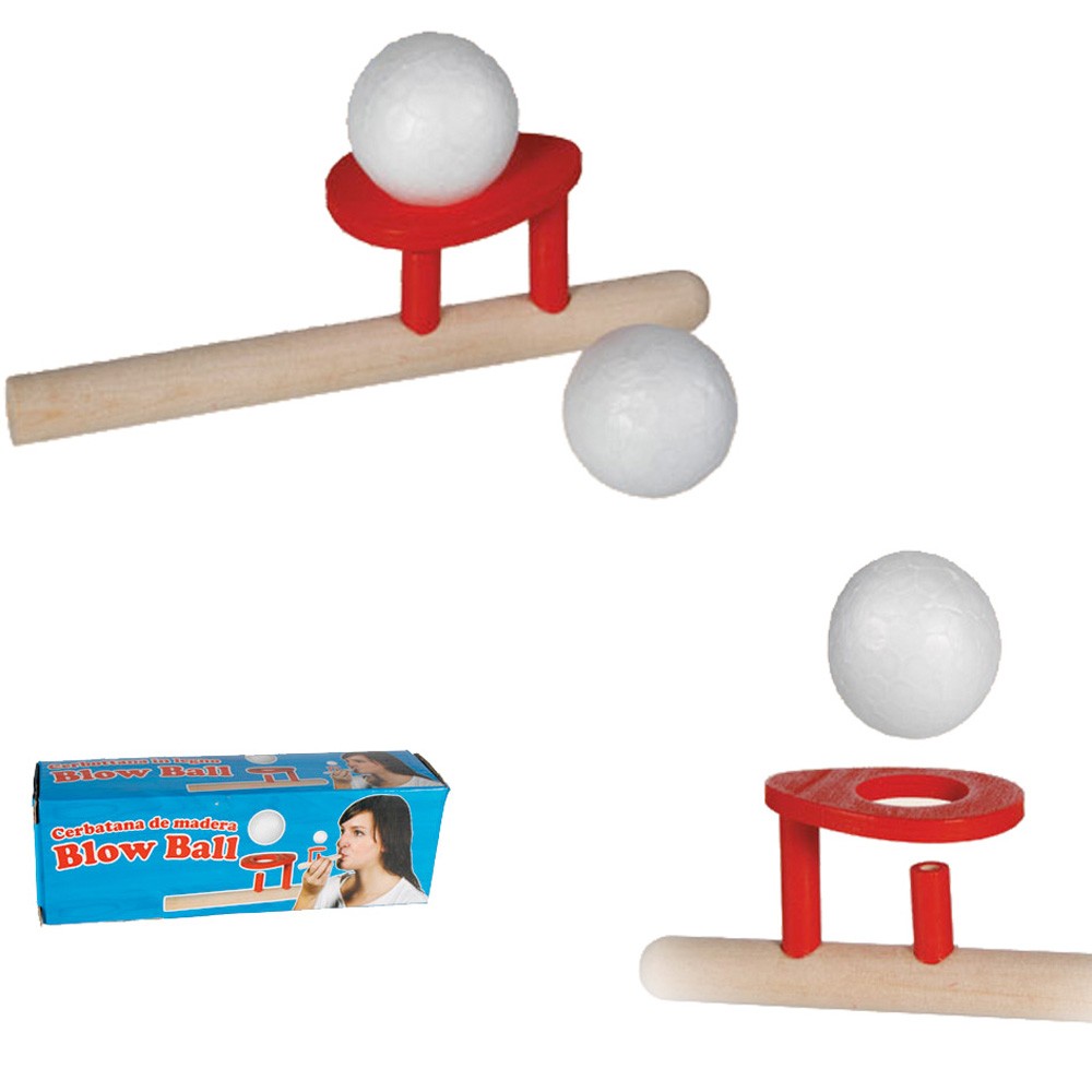 Pipara de madera con bola flotante. Consiste en una bola de corcho que se queda suspendida en el aire al soplar. Muy divertido para fiestas y encuentros. Incluye 2 bolas de corcho. Ideal para regalo. Medidas: 15 cm.