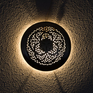 Plafón o aplique redondo pantalla para pared o techo, idela para la decoración árabe morderna, estilo andalusi, morisca. Ideal para la decoración en habitaciones, salones, pasillos, baños... Gracias y su calado con diseños geometricos creara un ambiente acogedor, difuminando la luz de manera homogenea y relajante.