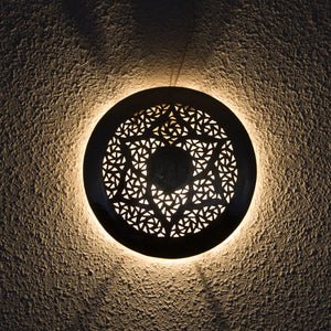 Plafón o aplique redondo pantalla para pared o techo, idela para la decoración árabe morderna, estilo andalusi, morisca. Ideal para la decoración en habitaciones, salones, pasillos, baños... Gracias y su calado con diseños geometricos creara un ambiente acogedor, difuminando la luz de manera homogenea y relajante.
