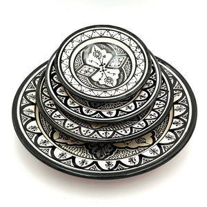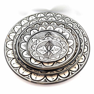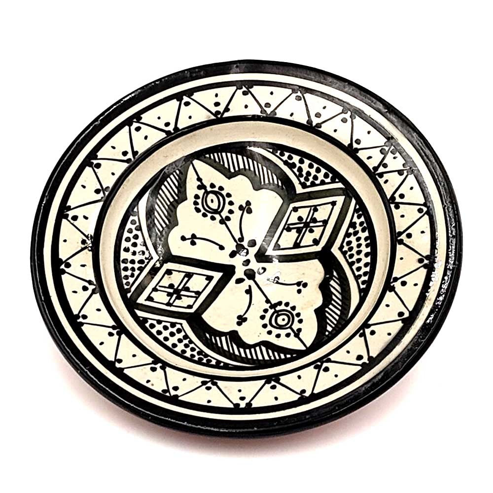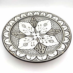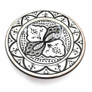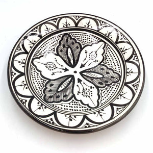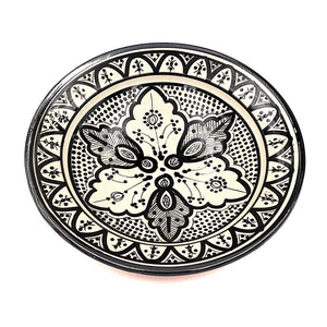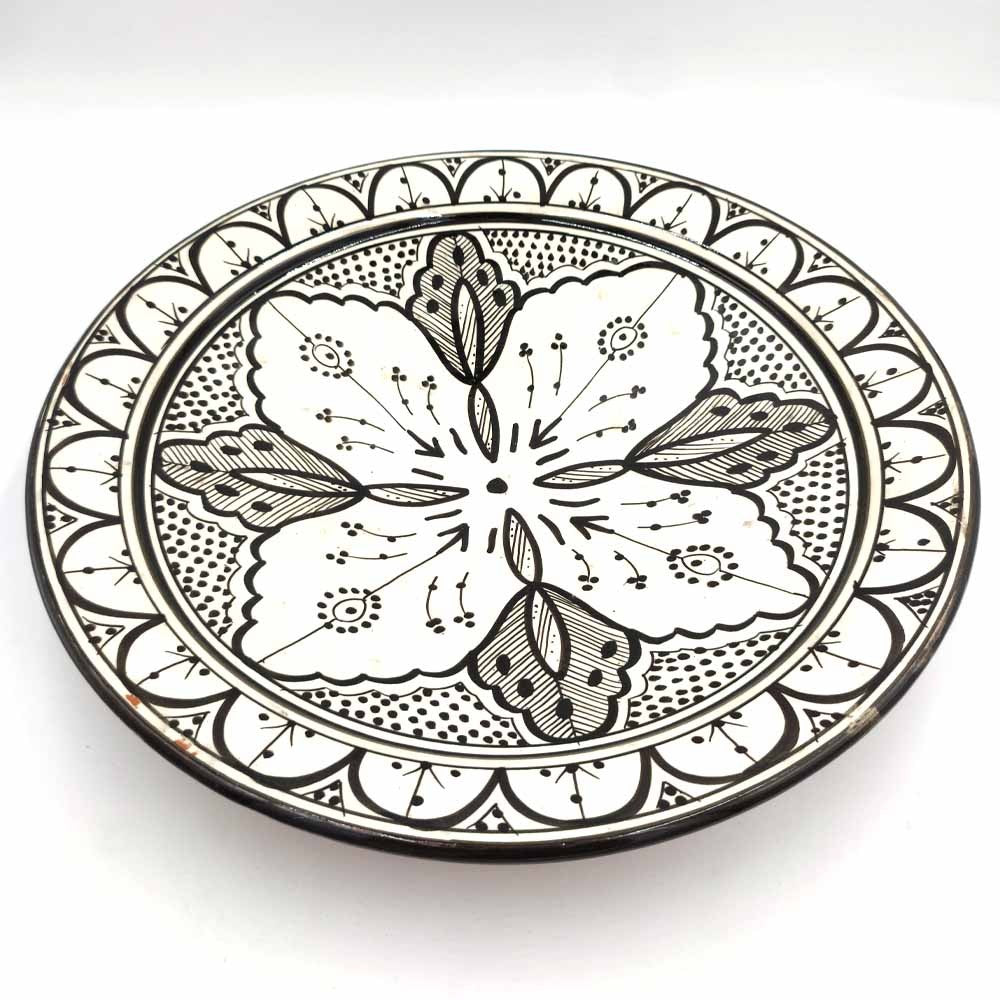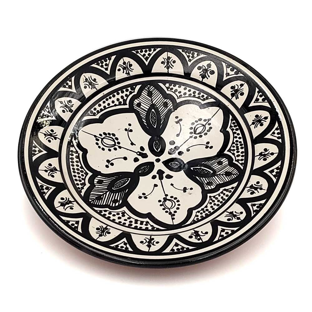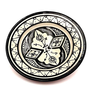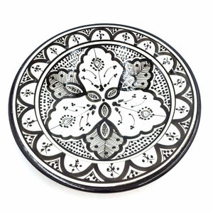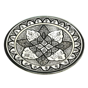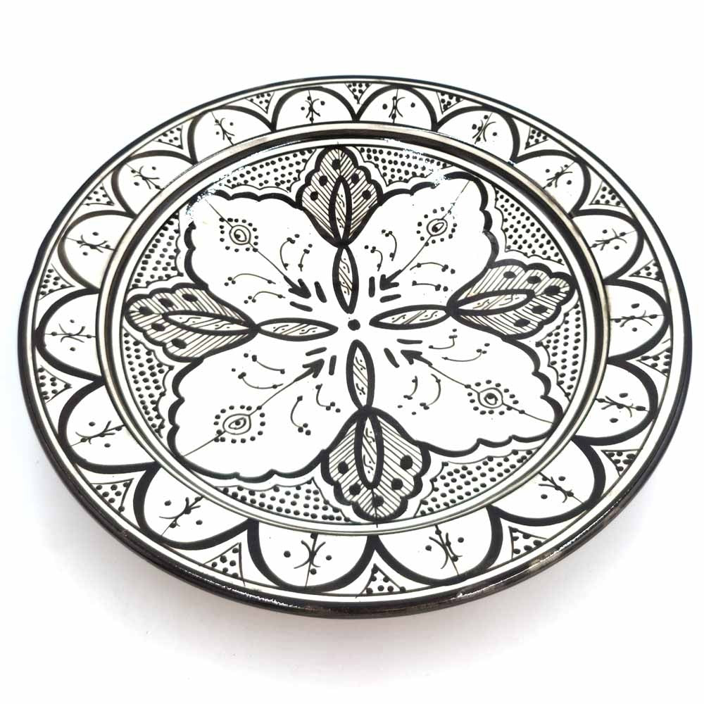 Plato de Cerámica estilo andalusí para decorar su hogar con artesanía Marroquí. Colores Blanco y negro que pegaran con cualquier todo de la decoración de su hogar, dándole un toque árabe gracias a los motivos pintados a mano por artesanos.