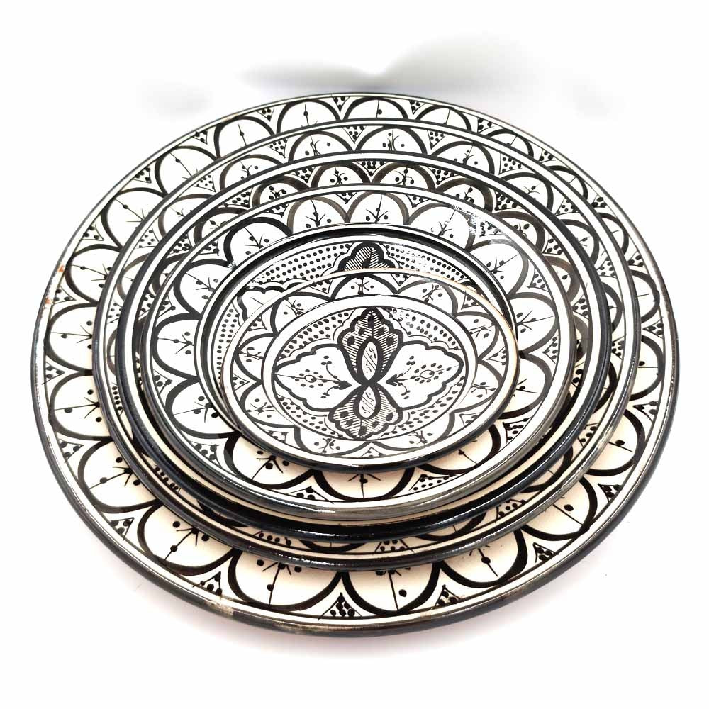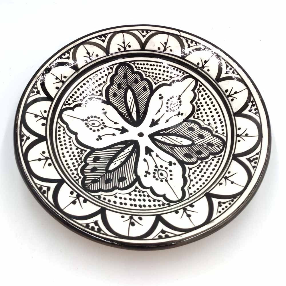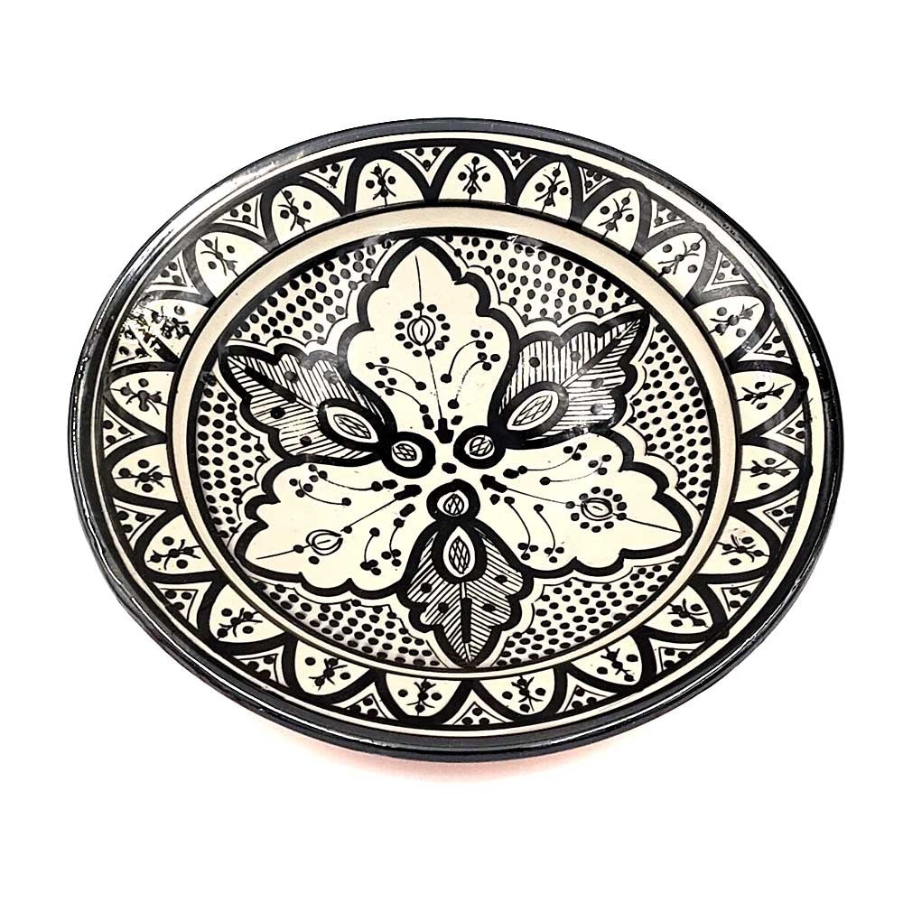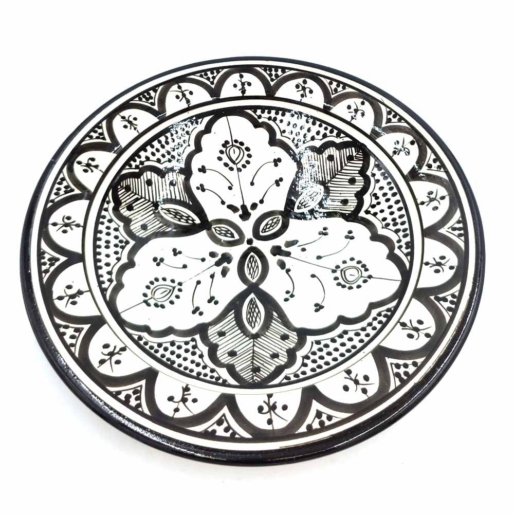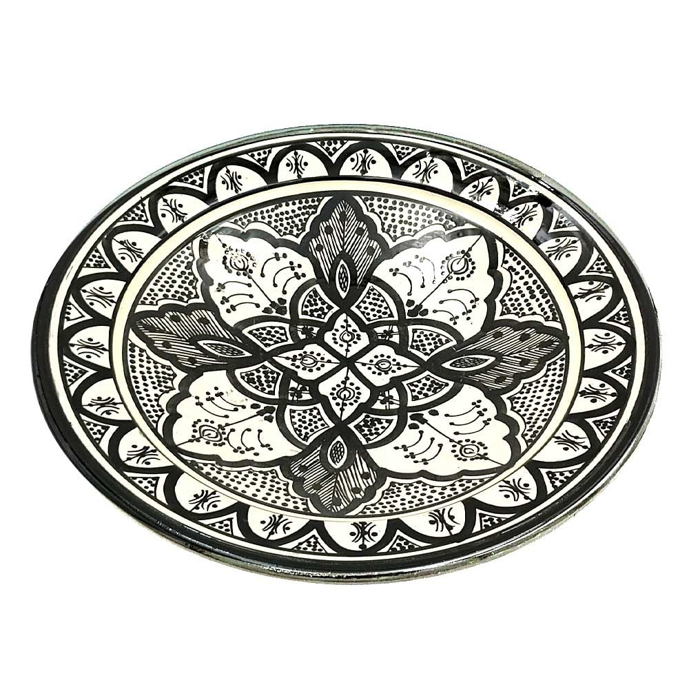 Plato de Cerámica estilo andalusí para decorar su hogar con artesanía Marroquí. Colores Blanco y negro que pegaran con cualquier tipo de la decoración de su hogar, dándole un toque árabe gracias a los motivos pintados a mano por artesanos.