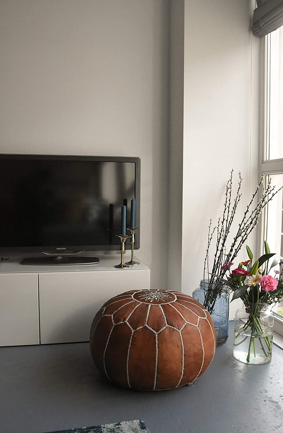 Perfecto como reposapiés, asiento adicional o como una elegante pieza de decoración alrededor de su hogar, nuestro puf es práctico y multifuncional. Combina confort y diseño y agrega autenticidad y un toque bohemio a cualquier tipo de decoración. Para la fabricación de este artículo, los artesanos marroquíes locales tiñen y cosen piezas individuales de cuero con costuras hechas a mano. Todos los tintes utilizados son vegetales y naturales. Tenga en cuenta que las variaciones de color natural y las arrugas hacen parte de las características únicas del cuero y solo agregan belleza y carácter al artículo.